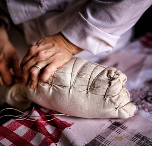 Le roulage est la signature ultime de la Volaille de Bresse. À la fin de l’élevage, la volaille est délicatement roulée et enveloppée dans une toile végétale, puis laissée au repos. Cette étape d’affinage homogénéise le gras, resserre la chair et sublime les arômes.
