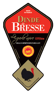 Dinde de Bresse Elle doit impérativement comporter le logo officiel AOP (rouge et jaune), seul label européen garantissant l’origine et le savoir-faire.